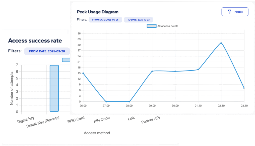 The dashboard also monitors access success rates. If doors frequently fail to open, it can indicate technical problems or user experience issues. Early visibility helps administrators address risks before they escalate.